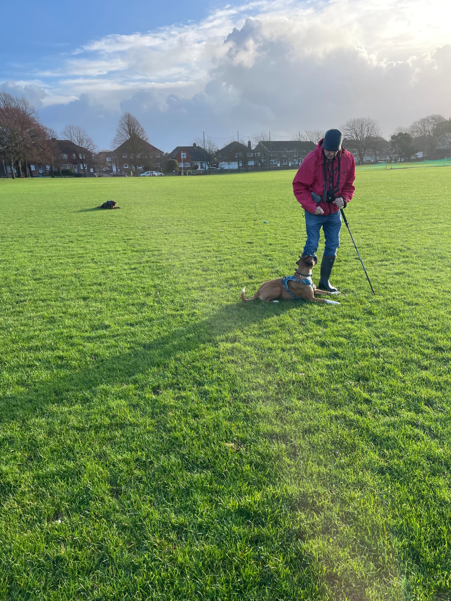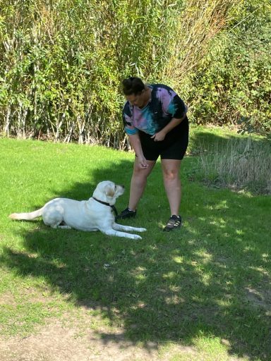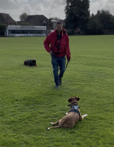 Hattie learning Down in a busy park with dogs present